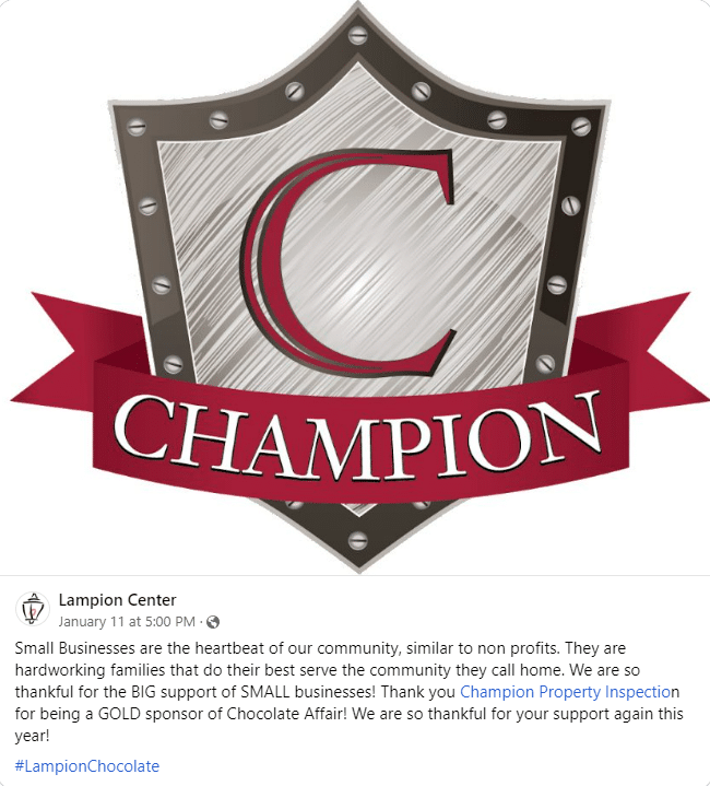 Champion Property Inspections is a proud gold sponsor for the Lampion Center Chocolate Affair event taking place on February 1, 2025. Their mission is empowering individuals, children, and families by lighting their path through innovative counseling solutions and dynamic community engagement. Lampion Center has a team that provides exceptional therapy, family-strengthening services, training, and outreach, prompting others in the community to continually seek their help and expertise.