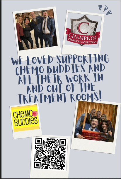 No one should face cancer alone. That’s why Champion Property Inspection proudly supports Chemo Buddies! Their Cork and Fork event is coming up on March 6th at 5:30, and it’s a fantastic way to contribute to their incredible work. Let’s rally together and provide hope for everyone affected by cancer. Get your tickets and learn more about Chemo Buddies here: https://www.chemobuddies.org/
