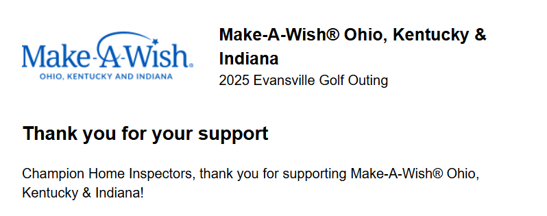 Champion Property Inspection is proud to support Make-A-Wish® Ohio, Kentucky & Indiana through their 2025 Evansville Golf Outing. Giving back to our community and helping make wishes come true is a cause close to our hearts.
