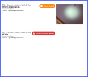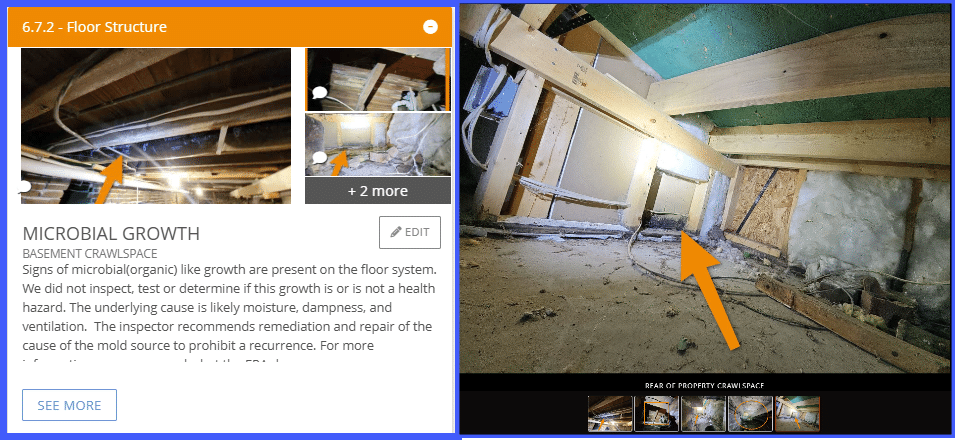 Here’s a screenshot of ours for demonstrative purposes. At Champion, we ensure you are informed. We may even call you directly to discuss the findings and offer our mold testing services. In our reports, we document the locations, use directional arrows for clarity, and provide hyperlinks to the EPA’s website for information on mold safety. We also use specific narratives to clearly distinguish between minor and significant mold issues.