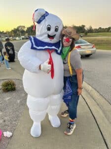 Marshmellow Man and the Rodeo Clown passing out candy at a local Trunk or Treat!